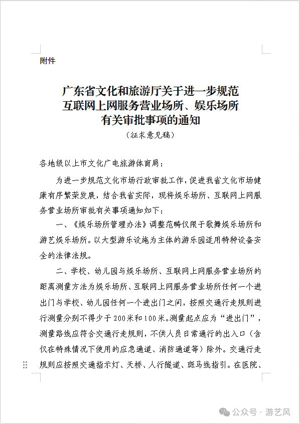 广东省文化和旅游厅公开征求《广东省文化和旅游厅关于进一步规范互联网上网服务营业场所、娱乐场所有关审批事项的通知》意见的公告原广东省文化厅于2017年印发的《关于贯彻执行〈娱乐场所管理办法〉的通知》已到期。为加强政策衔接,规范行业管理,近期我厅组织起草了《广东省文化和旅游厅关于进一步规范互联网上网服务营业场所、娱乐场所有关审批事项的通知(征求意见稿)》,现向社会公开征求意见。公众可通过以下方式提出反馈意见: 1.通过电子邮件将意见发至:wl_gdwltscc@gd.gov.cn。邮件主题请注明“规范性文件征求意见”。 2.通过信函方式将意见寄至:广州市越秀区东风东路701号广东省文化和旅游厅市场管理处(邮编:510080)。请在信封上注明“规范性文件征求意见”。 意见反馈截止日期为2025年9月8日。 特此公告。 附件:广东省文化和旅游厅关于进一步规范互联网上网服务营业场所、娱乐场所有关审批事项的通知(征求意见稿).doc 广东省文化和旅游厅 2025年8月29日 ![]() ![]() |