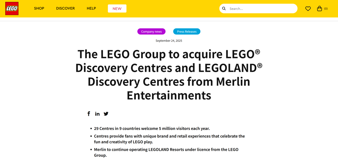 9月24日,乐高集团在官网发文宣布,已同意以2亿英镑从主题公园运营商默林娱乐集团手中收购乐高探索中心(LEGO Discovery Centres)和乐高乐园探索中心(LEGOLAND Discovery Centres)。此次收购将涵盖9个国家的29家探索中心,每年吸引约500万游客。