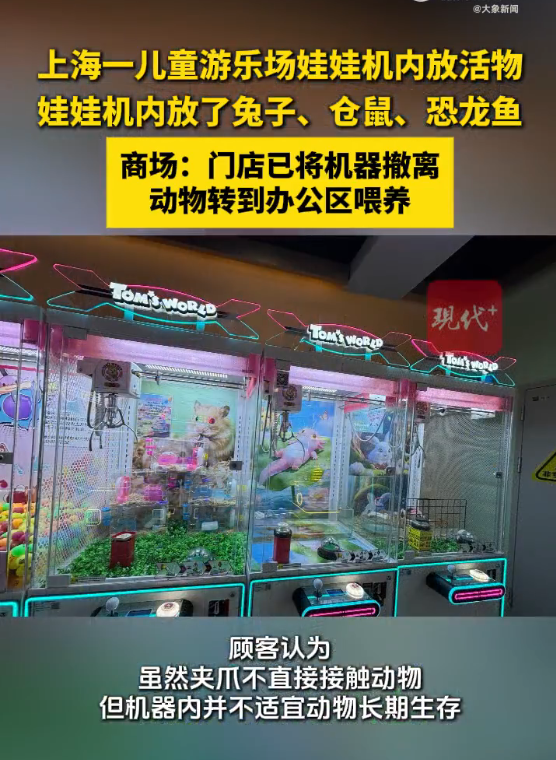 近日,有顾客发现,上海浦东新区一家商场内的汤姆熊欢乐世界门店内,有 3 台娃娃机内放了活体动物。顾客认为,虽然夹爪不直接接触动物,但机器内并不适宜动物长期生存。1 月 3 日晚,现代快报记者联系到商场管理方相关人士,对方表示门店已将娃娃机撤离,原有动物也挪至办公区饲养。