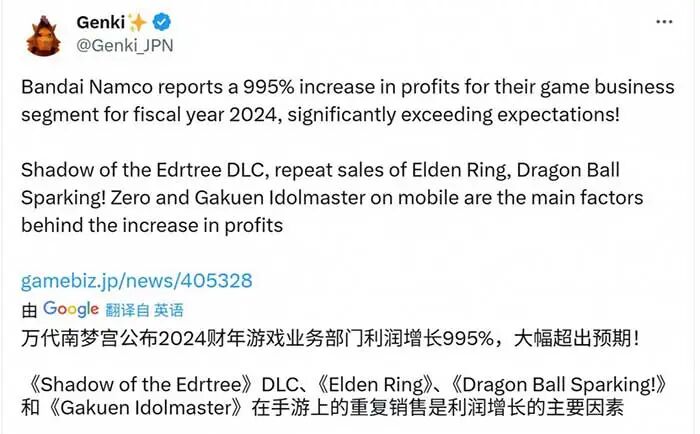 游乐快讯:万代南梦宫财报:利润创下历史记录 增长995%