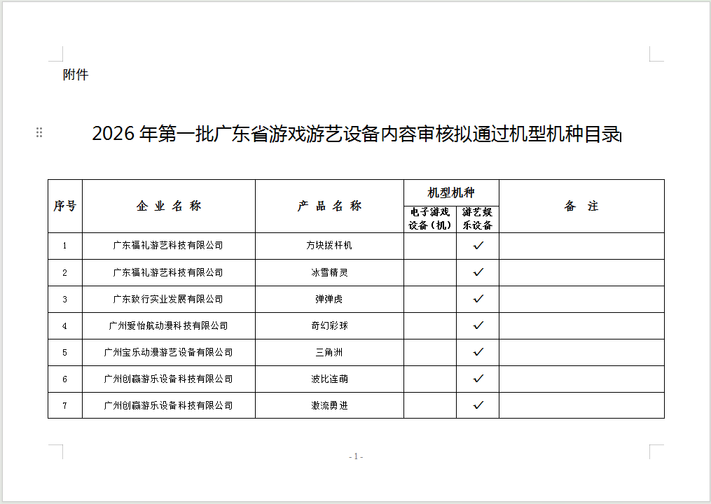 根据文化和旅游部《游戏游艺设备管理办法》等相关规定,现将我厅组织审核通过的《2026年**批广东省游戏游艺设备内容审核拟通过机型机种目录》(详见附件)进行公示,公示期为2026年1月28日至2月3日,共7日。
