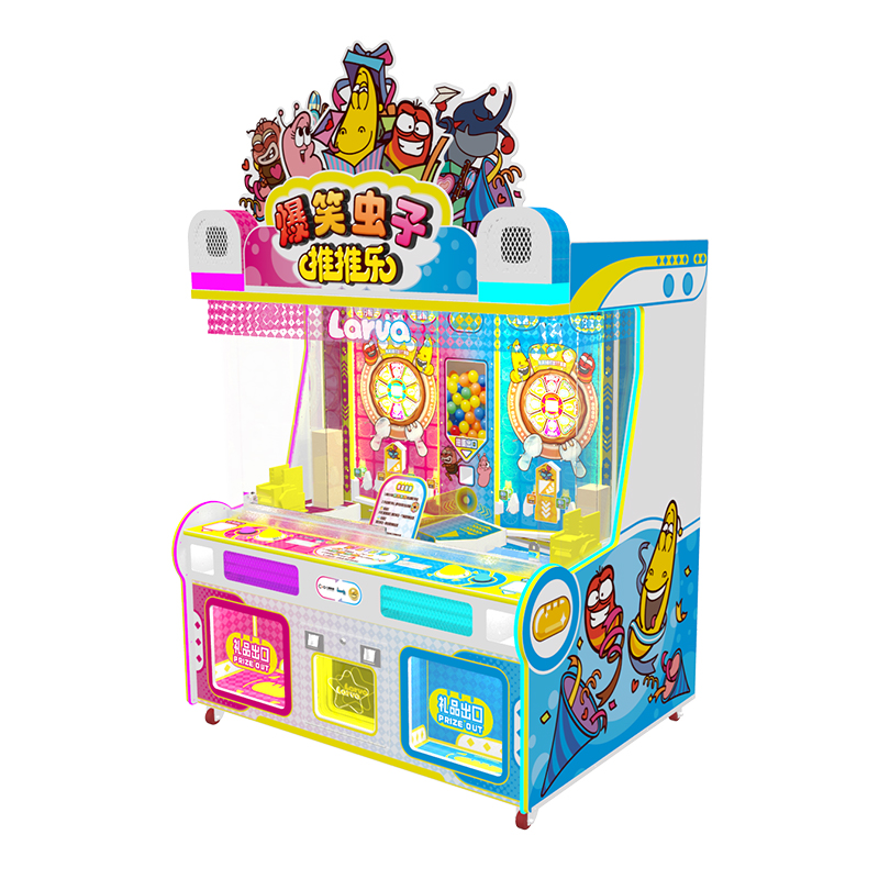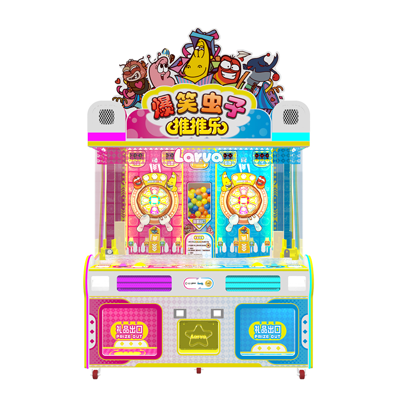 《推推乐》是一款以“爆笑虫子”IP为主题的一款游艺及,投入代币,兑换游戏球数看准摆针方向或通过摆针启/停按键控制摆针方向,瞄准通道按下开始键,控制下球,当小球下落,经过钉盘通道,获得相应奖励并点亮通道灯。当收集满4盏通道灯可获得分数/小球奖励启动跑灯转盘,对应获得跑灯所停位置奖励或功能(分数/珠子/扭蛋/盲盒)。集满3盏盲盒灯,获得盲盒奖励,珠子奖励从赠珠口落入到推盘,至推盘下,每推下一颗珠子,获得1分,集满指定分数获得卡片奖励,卡片出口及时获得。扭蛋/盲盒奖励,落入到推盘自推盘推下,最终在礼品出口获得。让玩家在游戏中既可锻炼头脑的反应能力又能获得**的游戏体验感。